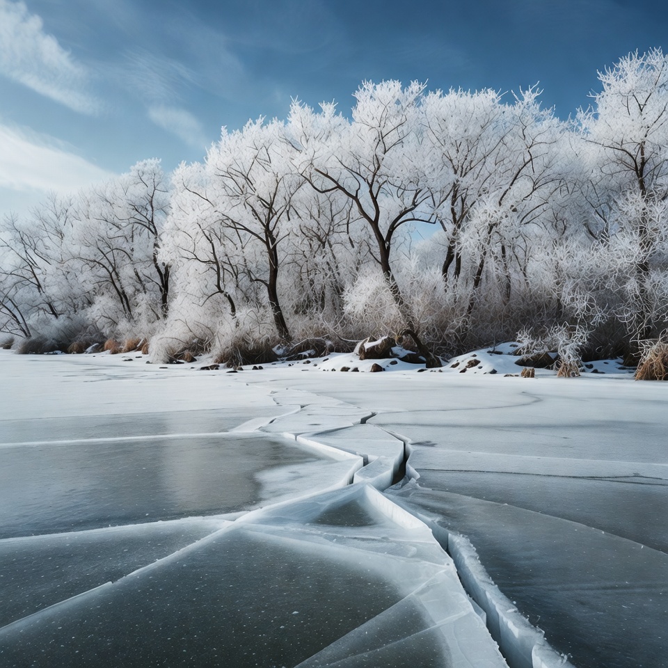Cracked Ice on Frozen Lake with Frosted Trees