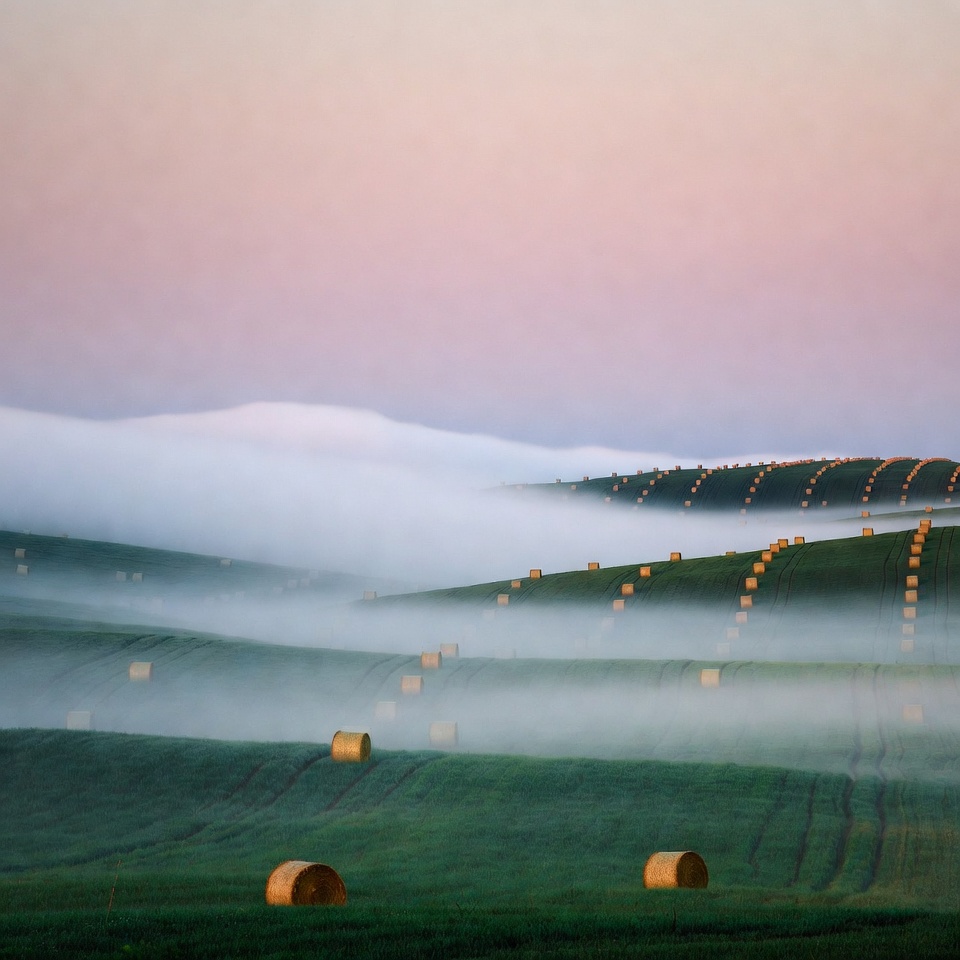 Golden hay bales are scattered across rolling green fields shrouded in thick morning fog. Distant mountains are faintly visible through the mist under a pastel pink and purple sky. The landscape features undulating hills with rows of neatly placed bales.