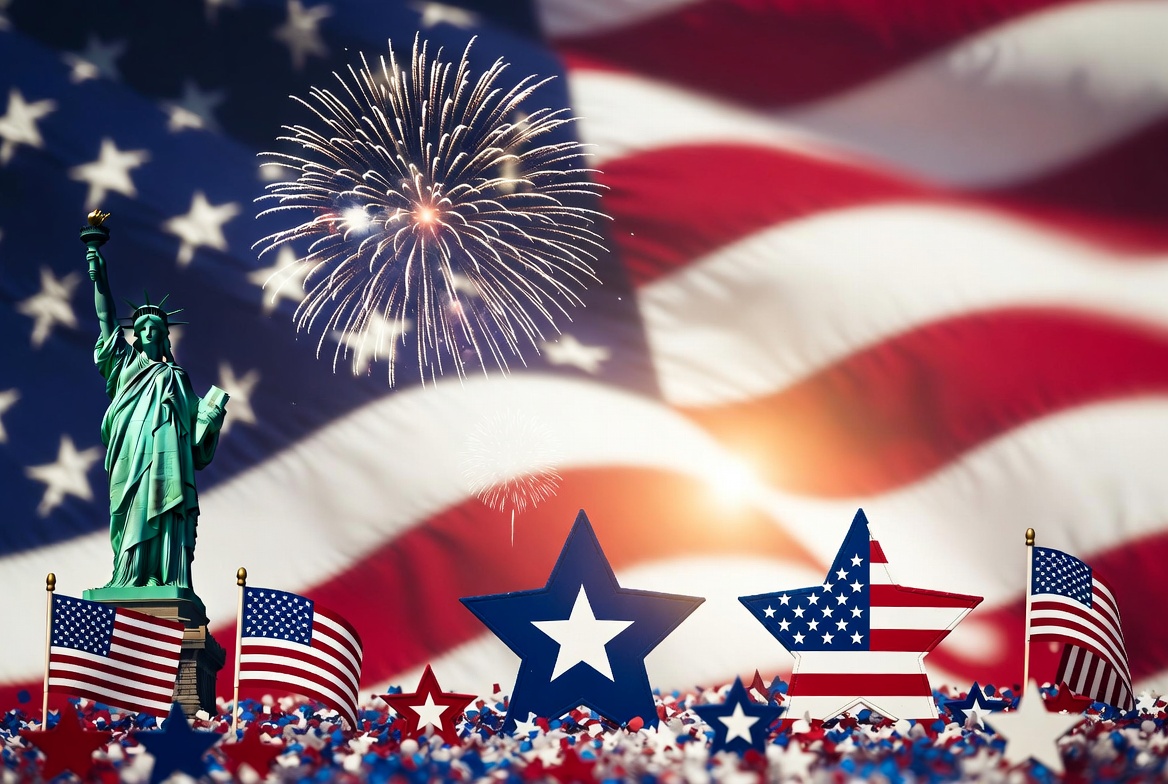 The Statue of Liberty stands prominently against a waving American flag background with exploding fireworks. American flags and red, white, and blue stars are scattered in the foreground. A sunset glow illuminates the patriotic scene.