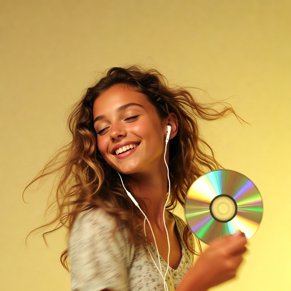 A young woman with long wavy brown hair smiles happily while holding up a shiny CD disc. She wears white earphones plugged into her ears and a light-colored top. The image features a plain yellow background.