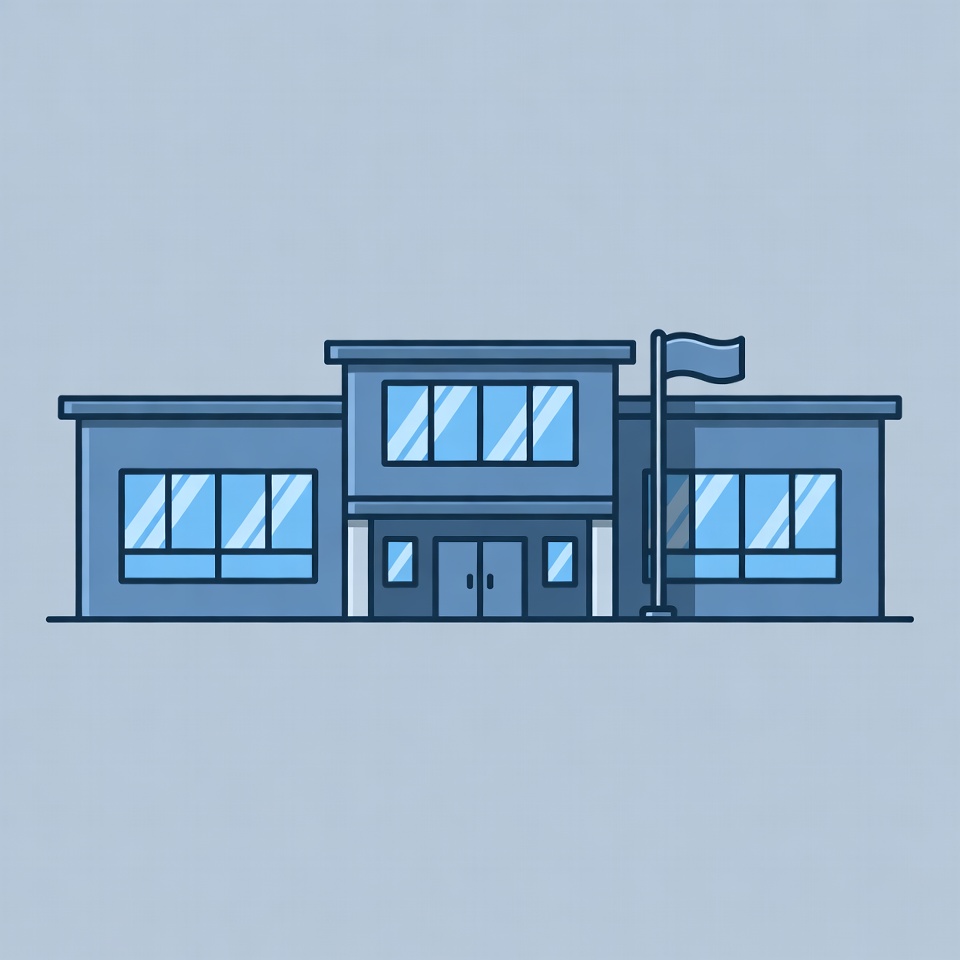 blue, building, clipart, educational building, entrance doors, flag, flagpole, flat roof, glass windows, illustration, institution, isolated background, line art, minimalistic, modern architecture, outline drawing, school, symmetric design, vector art, school building