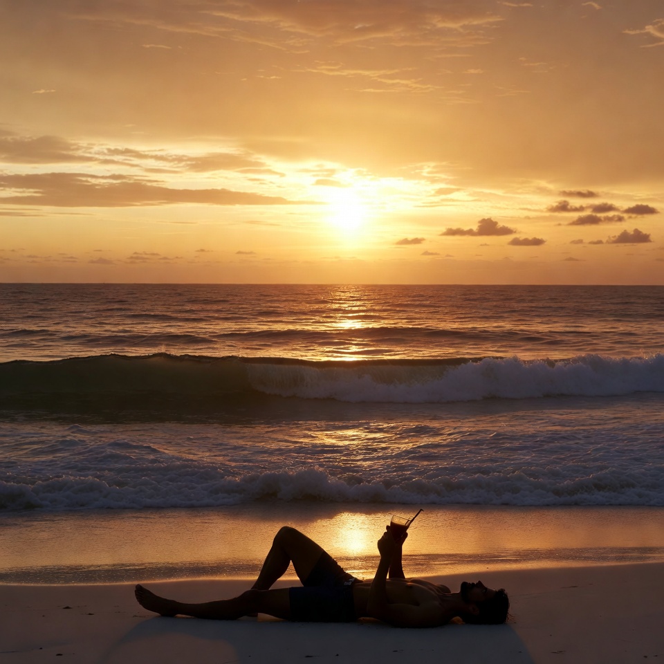 A silhouette of a shirtless man lies on the sandy beach, holding a phone with both hands while watching the vibrant orange sunset. Gentle waves crash on the shore in the background, with scattered clouds in the sky. He wears dark swim trunks and is positioned near the water's edge.