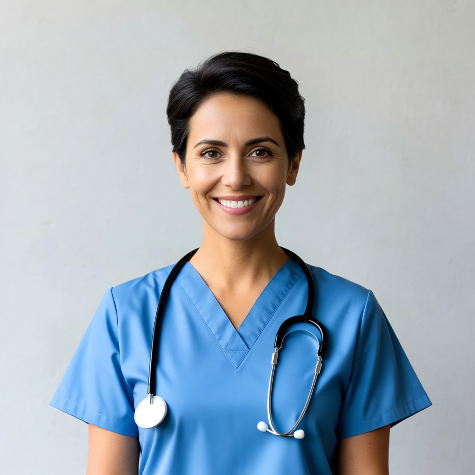 A woman with short dark hair and warm smile wears a blue nurse uniform and holds a stethoscope around her neck. She stands confidently against a plain white background. Her scrubs feature a V-neck design and the stethoscope has white earpieces.