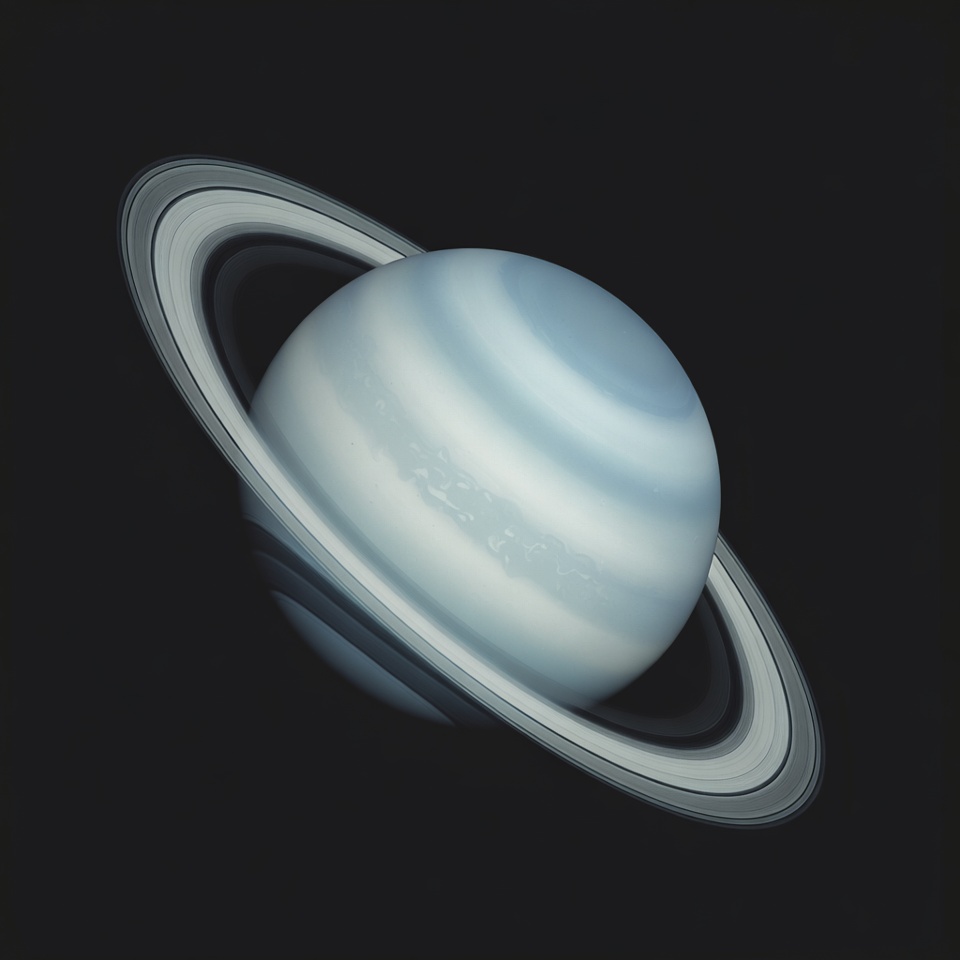 Saturn appears as a large, pale blue planet with prominent icy rings tilted at an angle. The planet features subtle banded cloud patterns in light cyan hues. It is isolated against a solid black space background.