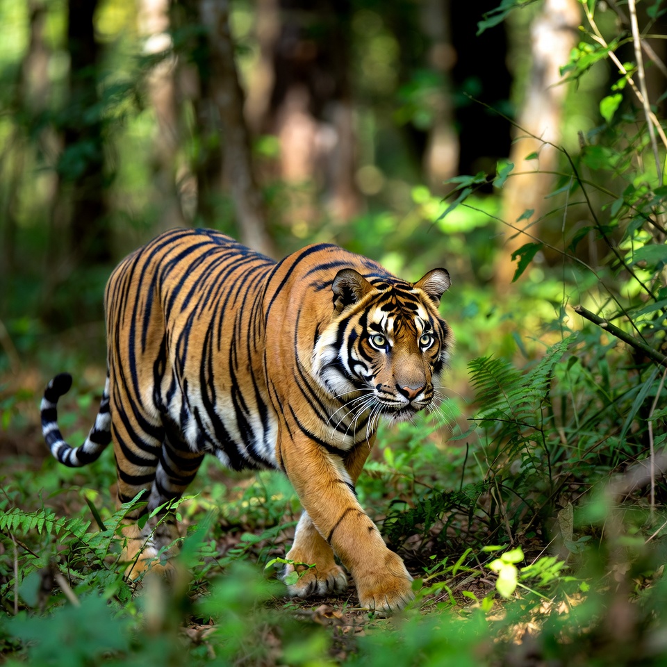 big cat, black stripes, dense foliage, ferns, forest, green plants, intense eyes, jungle, nature, orange fur, paws, predator, stalking, stripes, tail, trees, tropical forest, undergrowth, walking tiger, wild animal, wildlife, tiger
