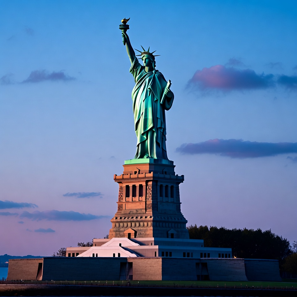 The Statue of Liberty stands tall on its pedestal with a torch raised in her right hand and a tablet in her left. She wears a flowing green robe and a spiked crown against a vibrant sunset sky with scattered clouds. The scene includes the statue's base, water, and distant greenery.