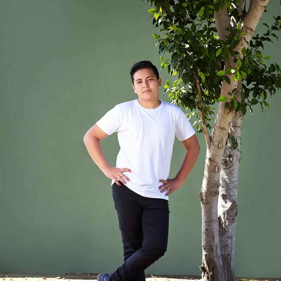 Latino, black hair, black pants, confident pose, green leaves, green wall, hands on hips, male, outdoor, posing, short hair, teen boy, tree, white t-shirt, young man, boy
