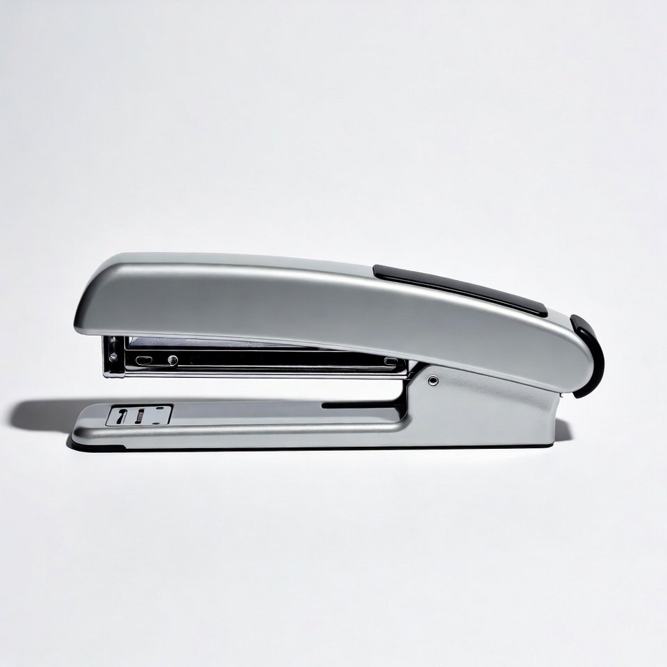 black accents, desktop stapler, ergonomic, isolated, metal stapler, metallic, office stapler, office supplies, silver stapler, staples, stationery, tool, white background, stapler
