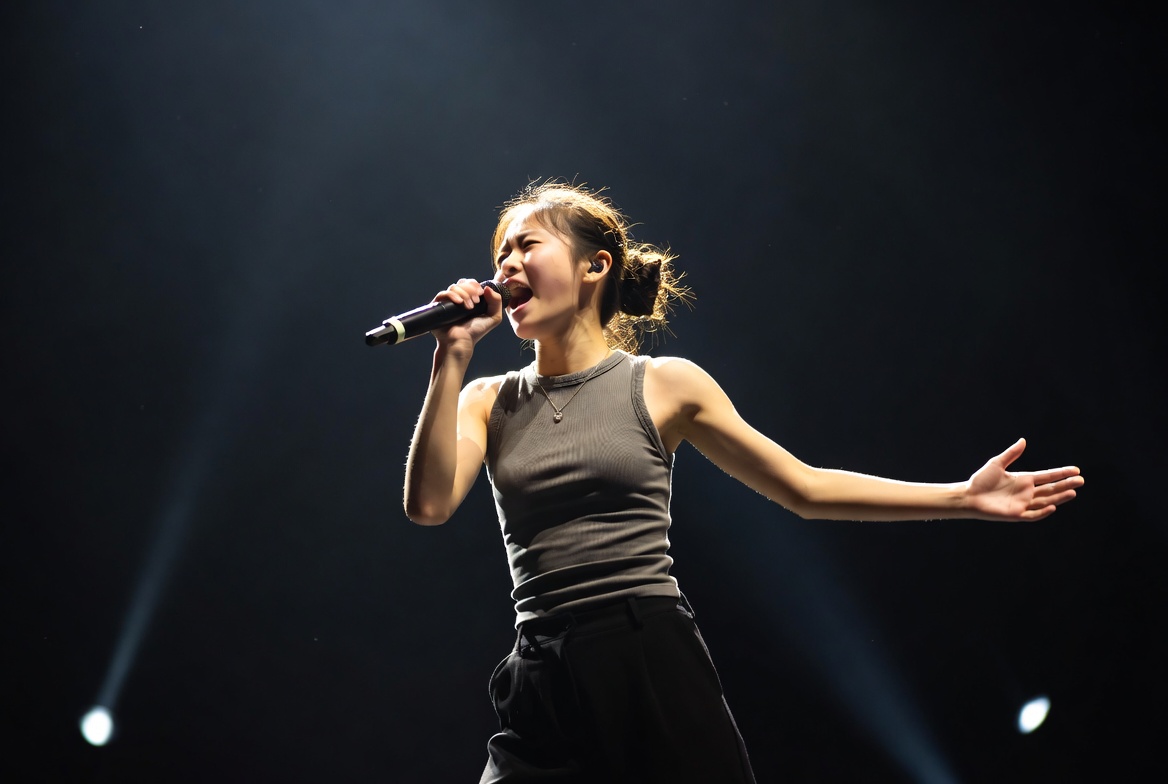 A young Asian woman with hair in a ponytail passionately sings into a microphone on a dark stage. She wears a gray tank top and black pants, with arms extended dramatically. Spotlights illuminate her performance against a black background.