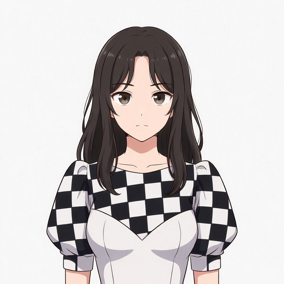 Asian, anime character, black hair, brown eyes, checkered blouse, checkered pattern, cute girl, female, front view, illustration, isolated background, long hair, manga style, portrait, puffed sleeves, white blouse, young woman, anime girl