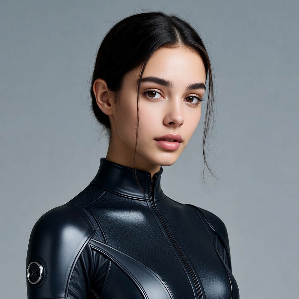 Asian, black bodysuit, bun hairstyle, closeup, dark hair, female, futuristic suit, glossy lips, gray background, high collar, intense gaze, leather clothing, metallic accents, portrait, young woman, zipper suit, woman