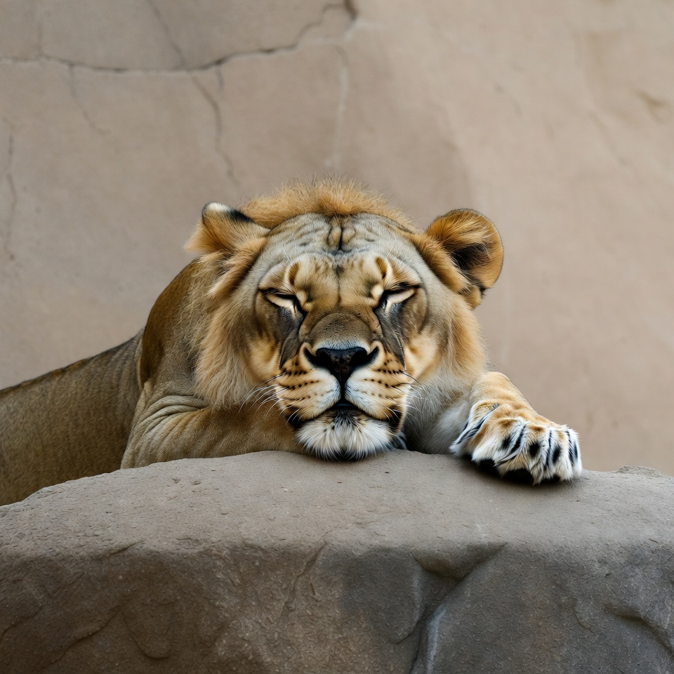 big cat, closed eyes, feline, golden fur, head resting, isolated background, majestic, mane, paws, predator, resting, rock, rocky background, sleepy lion, wild animal, wildlife, zoo animal, lion