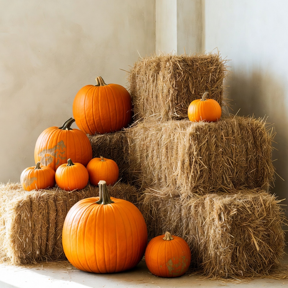 Various orange pumpkins of different sizes are stacked and arranged around tall hay bales. The scene is set against a light gray wall with a subtle gradient. The composition creates a classic autumn harvest display.