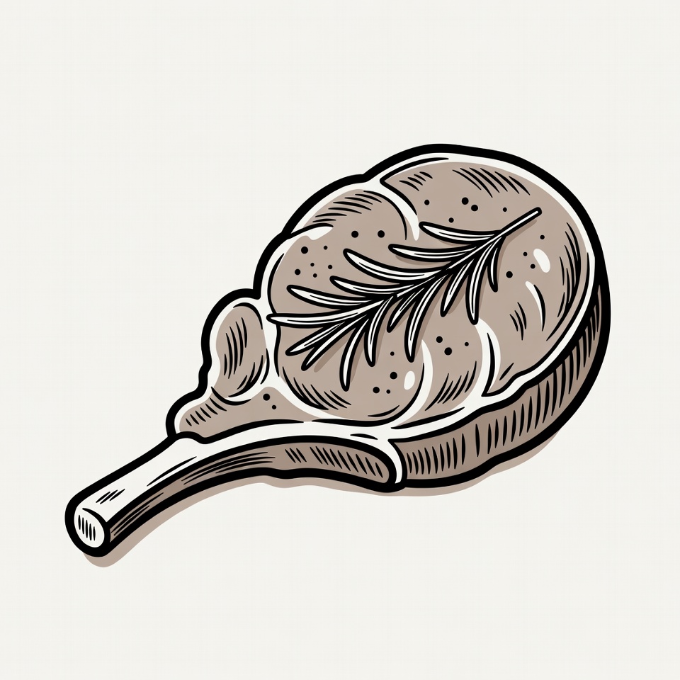bone, clipart, cuisine, dinner, food illustration, gourmet food, herb garnish, isolated background, line drawing, meat, pork rib, roasted pork, rosemary, steak, pork chop