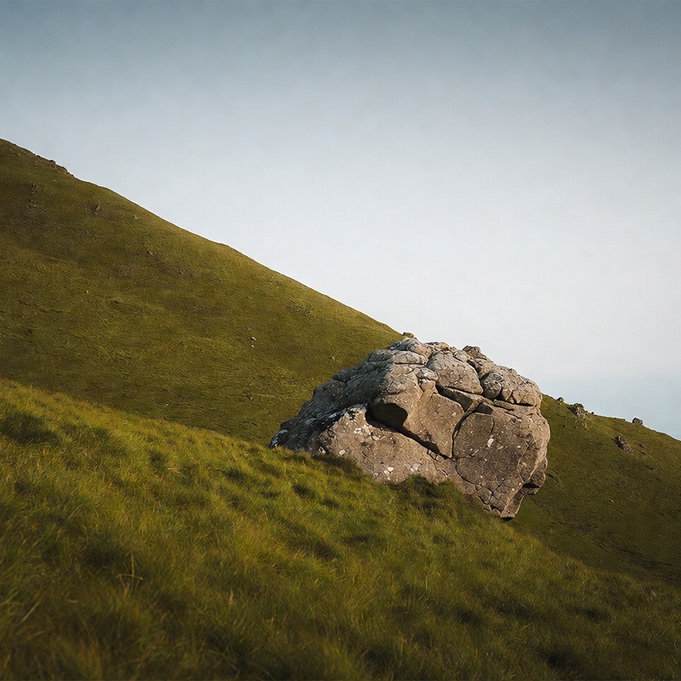 A large, rugged boulder sits prominently on a steep grassy hillside. The surrounding terrain features lush green grass and smaller rocks. The sky above is pale and cloudy.