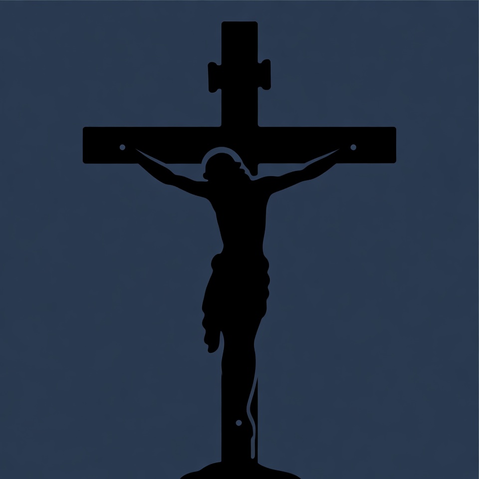A black silhouette of Jesus Christ crucified on a wooden cross stands against a dark blue background. The figure has outstretched arms, a cloth around the waist, and long hair. The cross features a visible stand at the base.