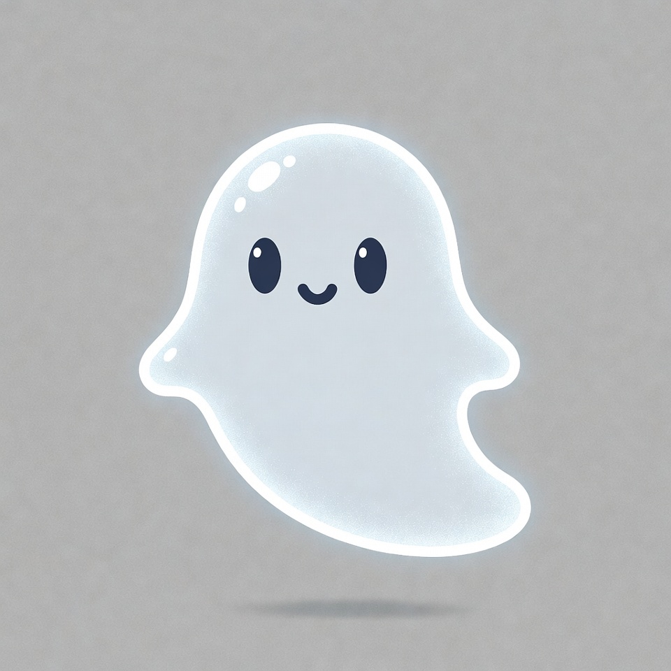 A cute white ghost with glowing neon outline floats on a gray background. It has large round black eyes and a small smiling mouth. The illustration features a bubbly, translucent body with a subtle shadow beneath.