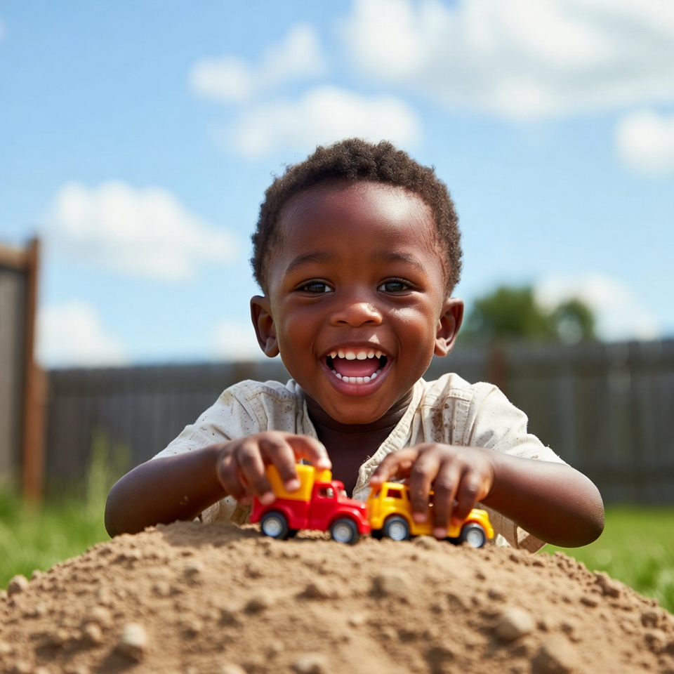 A young African-American boy with curly black hair smiles joyfully while holding two toy dump trucks on a dirt mound in the backyard. He wears a light beige shirt and is positioned in front of a wooden fence under a bright blue sky with clouds. The red and yellow toy trucks rest on the pile of soil surrounded by green grass.