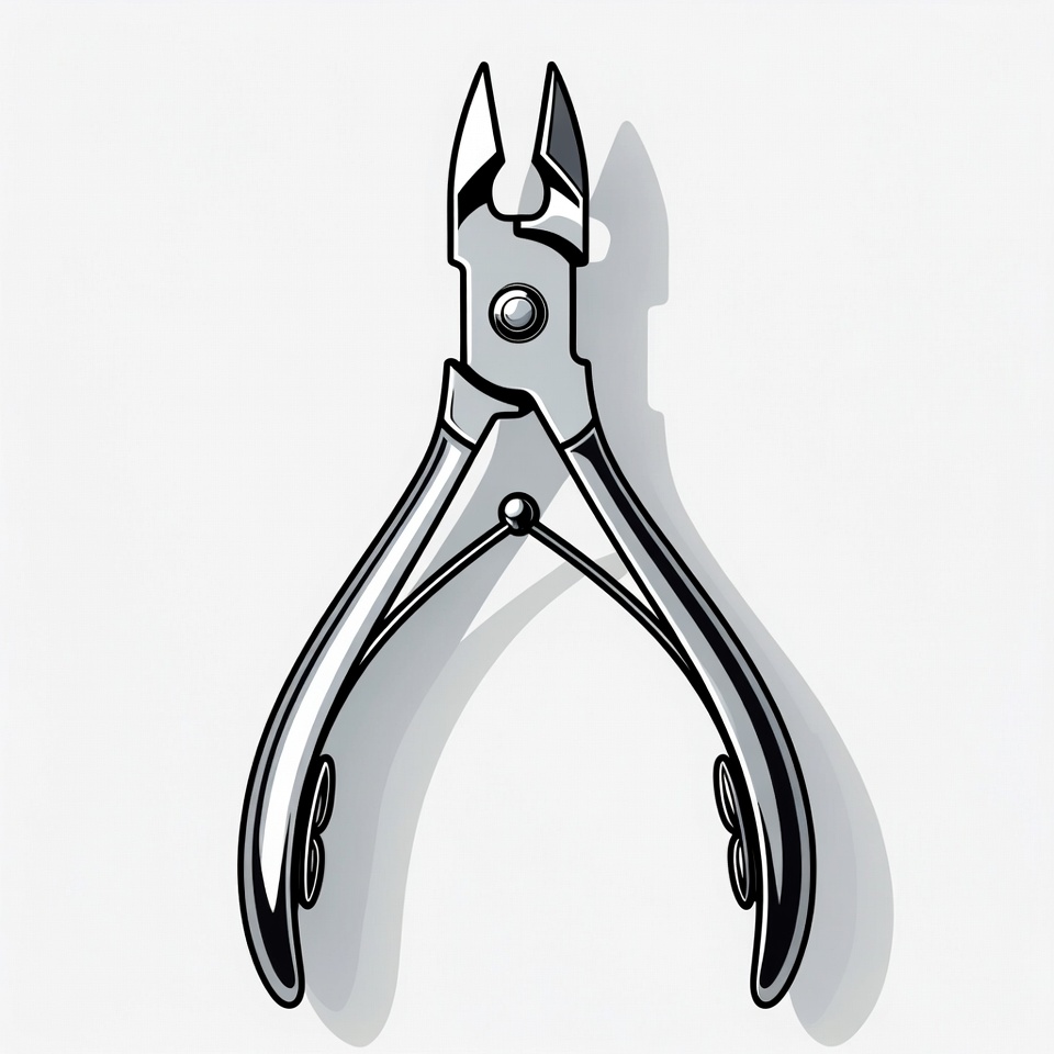 black outline, clipart, clippers, grooming tool, handles, illustration, isolated background, line art, manicure tool, metal clippers, nail cutters, pivot joint, pointed blades, shadow, silver clippers, vector art, white background, nail clippers