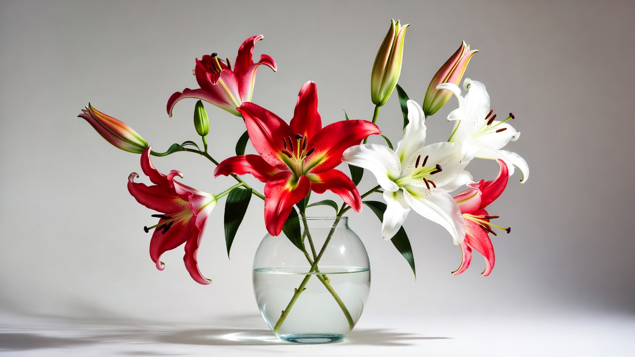 A bouquet of vibrant red lilies and elegant white lilies arranged in a clear glass vase filled with water. The flowers feature long green stems and buds, set against a plain light background. Subtle shadows enhance the composition.
