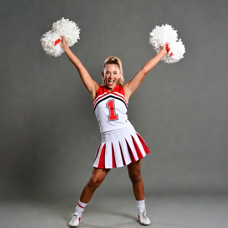 A young White woman with blonde hair in a ponytail wears a red and white cheerleader uniform with the number one on the top. She holds large white pom poms in both hands with arms raised high and stands in a wide-legged pose. She wears white sneakers with red socks on a gray background.