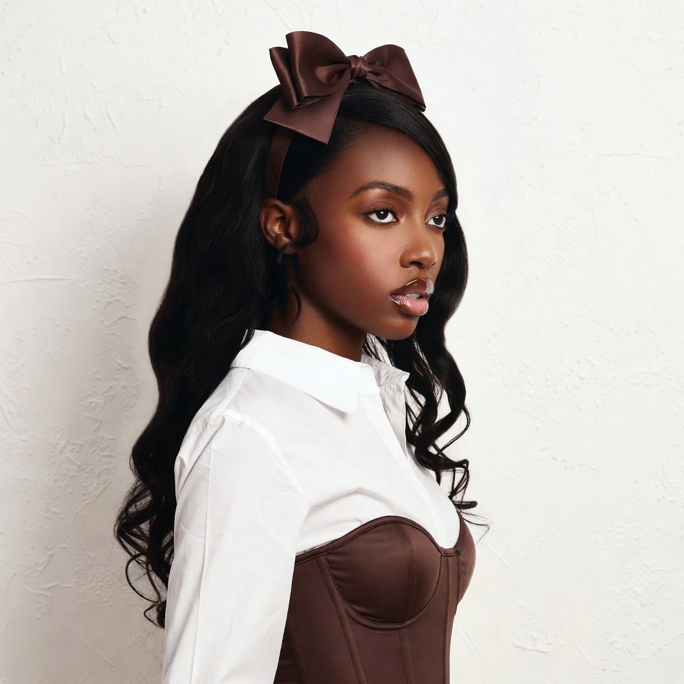 A young African-American woman with long wavy black hair wears a large brown satin bow headband. She has a side profile view, subtle makeup with glossy lips, and dons a white collared shirt paired with a brown corset top. She stands against a plain white background.