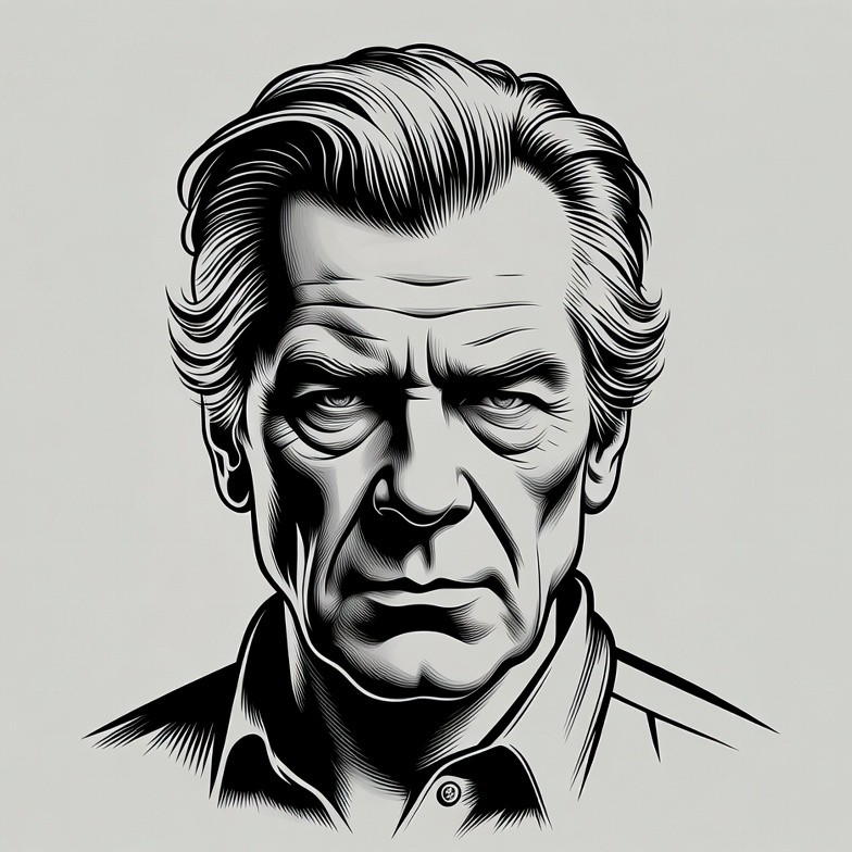 A black and white illustration of an older man with wavy gray hair and a stern expression stares directly forward. He wears a collared shirt with the top buttons undone. The portrait features bold line work and high contrast shading on a plain background.