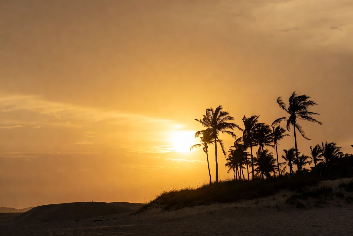 beach, clouds, coastal, dunes, evening, golden hour, grass, horizon, landscape, nature, ocean, orange sky, palm silhouettes, paradise, sand, sea, shore, silhouette, sky, sunlight, sunset, tropical, vacation, yellow sun, palm trees