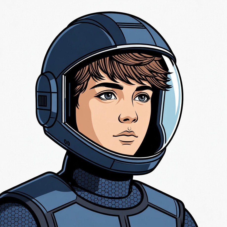 A cartoon illustration depicts a young boy wearing a futuristic blue spacesuit and helmet with a transparent visor. He has brown hair, blue eyes, and a neutral expression, viewed from the front. The design features hexagonal patterns on the suit against an isolated white background.