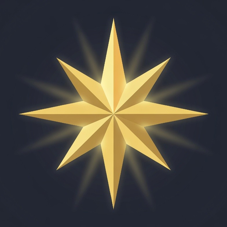 A vibrant golden eight-pointed star glows with bright rays against a dark navy background. The star features sharp, faceted edges and a luminous shine. It is centered and isolated on the solid background.