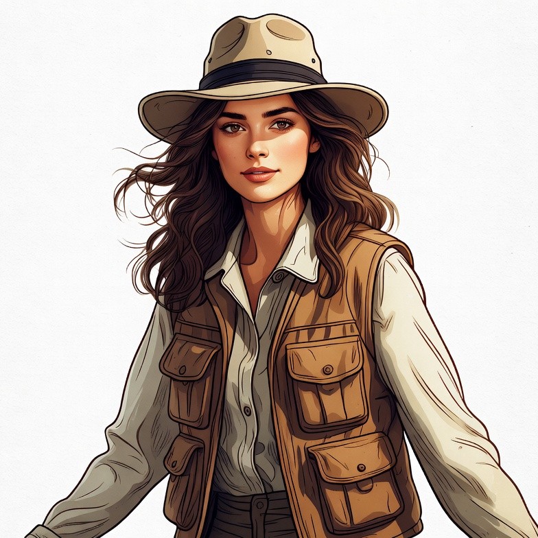 White, adventure outfit, adventurer, brown hair, collared shirt, digital art, explorer hat, explorer woman, fedora hat, female, illustration, isolated background, khaki pants, portrait, safari hat, safari vest, tan vest, wavy hair, white shirt, young woman, woman
