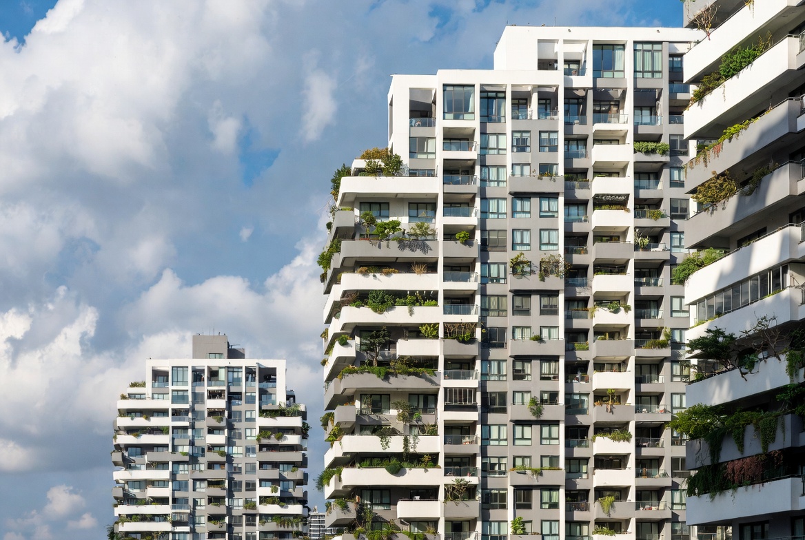 balconies, blue sky, cityscape, cloudy sky, glass windows, gray facades, green rooftops, high-rise, lush greenery, modern architecture, plants, rooftop garden, skyscrapers, sustainable design, tall buildings, urban, vegetation, vertical garden, white buildings, apartment buildings