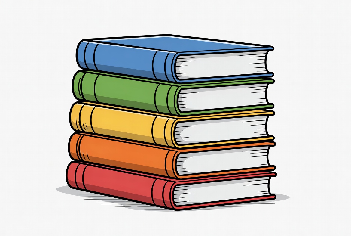 A vibrant stack of six hardcover books in rainbow colors sits on a white background. The books feature distinct covers in red, orange, yellow, green, blue, and purple hues with clean outlines. This clipart-style illustration highlights the books from a three-quarter angle.