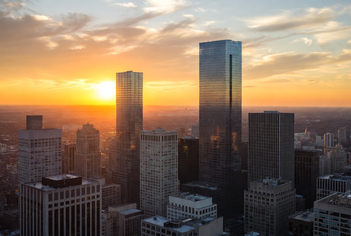 aerial view, architecture, buildings, city skyline, cityscape, clouds, dusk, glass towers, golden hour, high-rise, horizon, metropolis, orange sky, skyline view, skyscrapers, sunlight, tall buildings, urban landscape, warm light, sunset