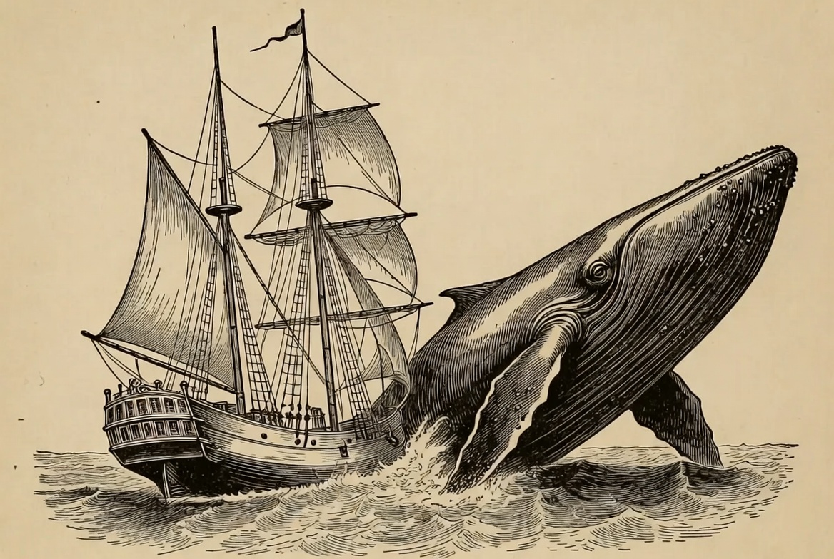 A detailed ink illustration depicts a large whale breaching dramatically from the ocean waves near a classic wooden sailing ship. The ship features multiple masts with billowing sails and a flag at the top. Waves splash around the whale's massive body and the ship's hull on an isolated background.