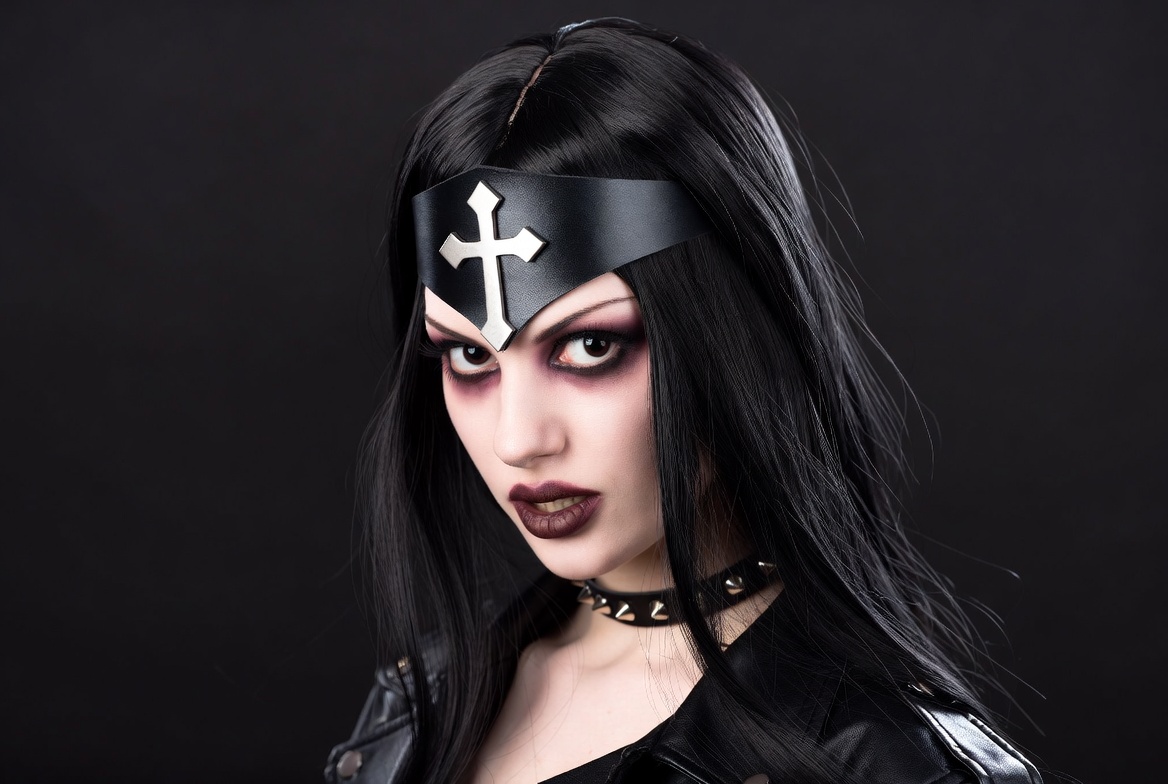 A woman with long black hair and dramatic gothic makeup stares intensely at the camera. She wears a black leather headband featuring a white inverted cross, a studded choker, and a black leather jacket. The image is set against a solid black background.