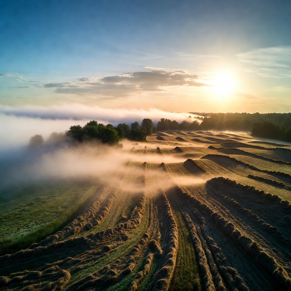 Aerial view of golden hay bales arranged in rows across green fields shrouded in thick morning mist. The sun rises behind scattered clouds, casting a warm glow over the undulating landscape with scattered trees. Fog drifts among the bales and grassy patches.
