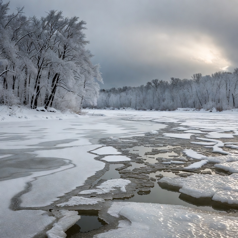 A frozen river winds through a snowy landscape lined with snow-covered trees. Cracked ice floats on the water's surface under a cloudy sky with rays of sunlight breaking through. Bare branches stand stark against the winter scene.