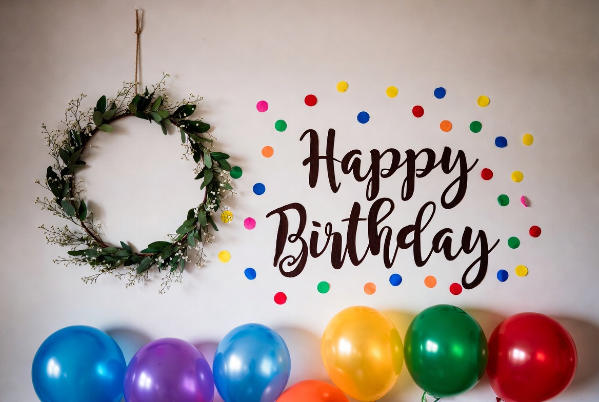 A colorful 'Happy Birthday' text hangs on a white wall surrounded by multicolored confetti dots. A green leafy wreath is suspended nearby, and a cluster of vibrant balloons in blue, purple, yellow, green, orange, and red sits at the bottom. The festive arrangement is isolated against the plain background.