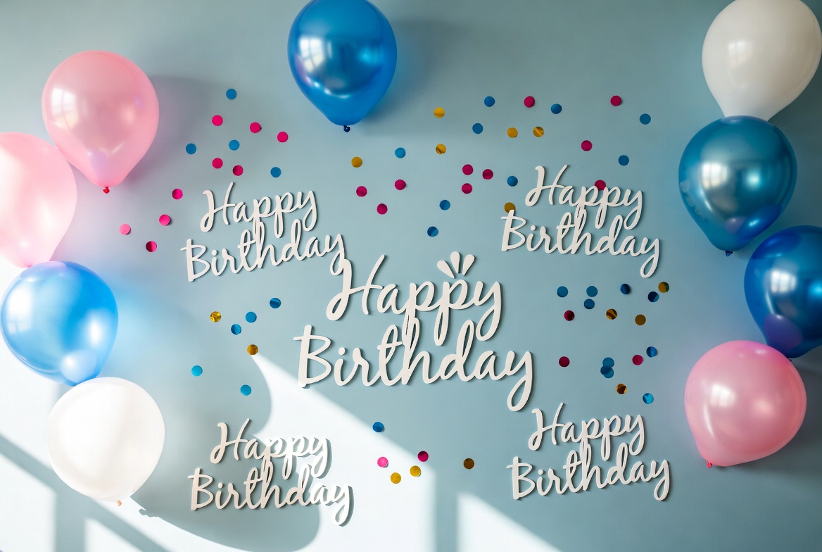 Colorful balloons in blue, pink, and white float against a light blue wall surrounded by 'Happy Birthday' letters in white script. Gold and multicolored confetti dots the background. The festive arrangement features multiple balloons and repeated celebratory text.