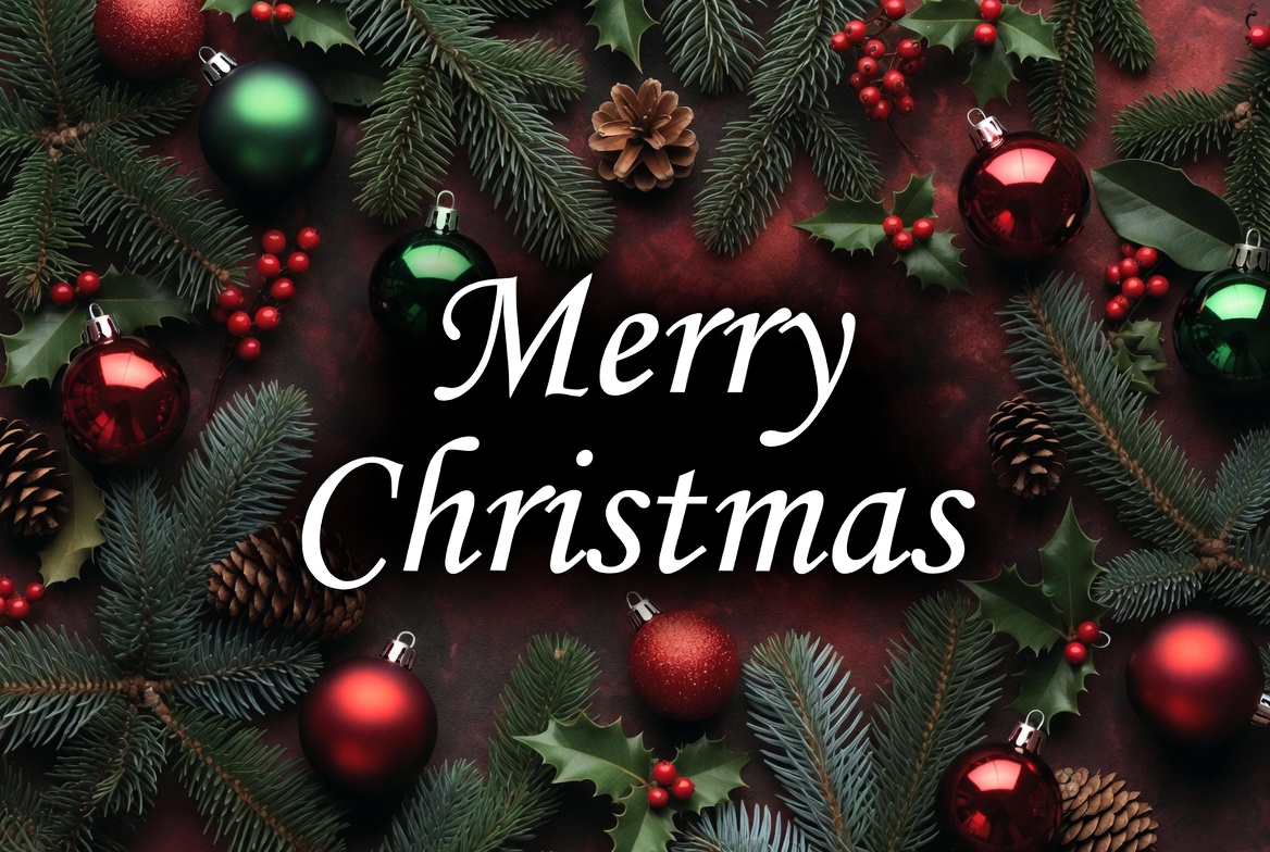 Christmas border, Christmas greeting, Christmas ornaments, Christmas wreath, dark red background, elegant text, festive frame, green baubles, holiday card, holiday decoration, holly leaves, isolated background, pine branches, pine cones, red baubles, red berries, seasonal decor, shiny ornaments, winter holiday, Merry Christmas