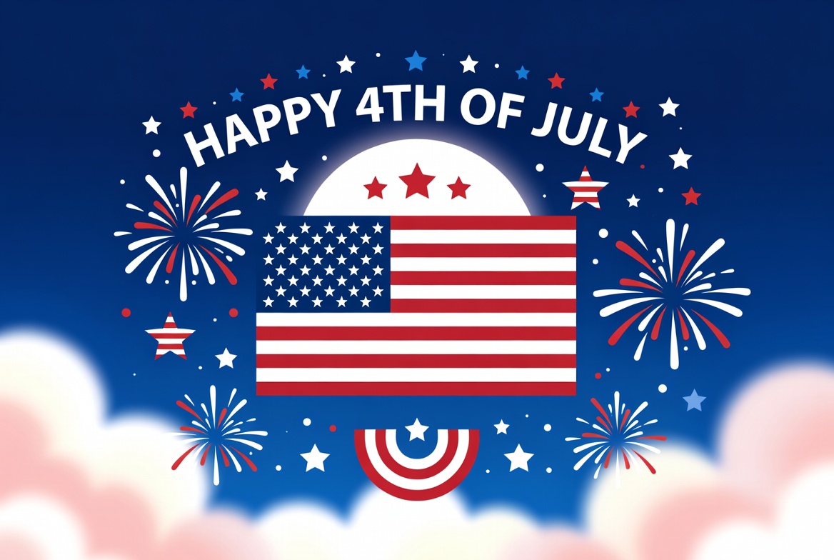 A vibrant illustration features a large American flag centered on a dark blue background with clouds. Fireworks, stars, and the text 'Happy 4th of July' surround the flag. Red, white, and blue colors dominate the festive design.