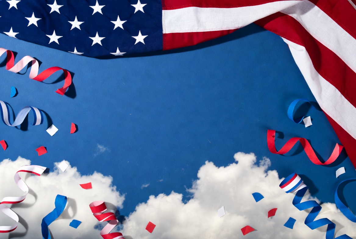 A large American flag with stars and stripes drapes across a solid blue background. Red, white, and blue ribbons and confetti scatter around it. Fluffy white clouds float in the upper part of the scene.