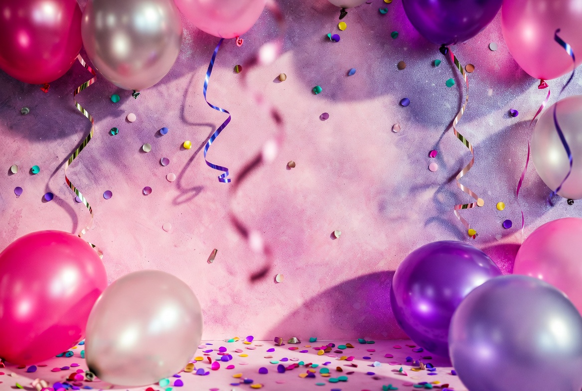 A vibrant cluster of pink, purple, and silver balloons floats against a soft pink background. Colorful confetti and ribbons scatter throughout the scene. The balloons are arranged in a festive, celebratory display.