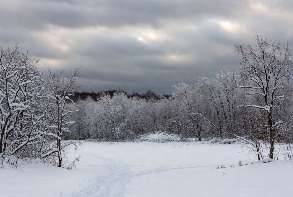 bare trees, birch trees, cloudy sky, cold weather, frost, frozen marsh, gray clouds, nature scene, overcast sky, snow path, snow-covered trees, snowy trail, sunlight rays, white snow, winter landscape, winter woods, snowy forest