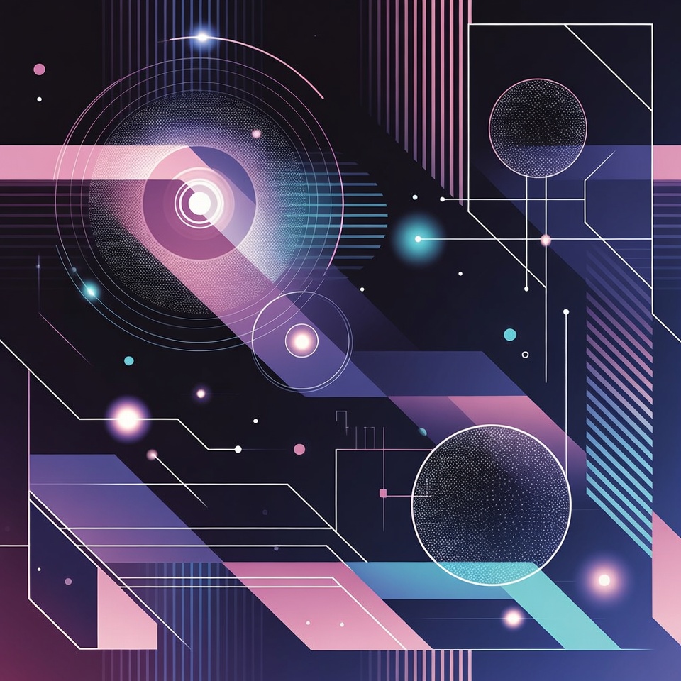 blue glow, cosmic pattern, cyan accents, dark backdrop, digital art, futuristic design, geometric shapes, glowing orbs, grid lines, halftone dots, illustration, light effects, modern art, neon lights, pink lines, purple circles, radial patterns, sci-fi aesthetic, vector graphic, vibrant colors, abstract background