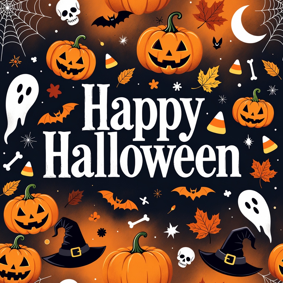 A vibrant Halloween illustration features carved pumpkins, ghosts, bats, spider webs, and candy corn scattered across a dark background. Bold orange text reads 'Happy Halloween' in the center. Autumn leaves, skulls, and a crescent moon add to the festive spooky design.