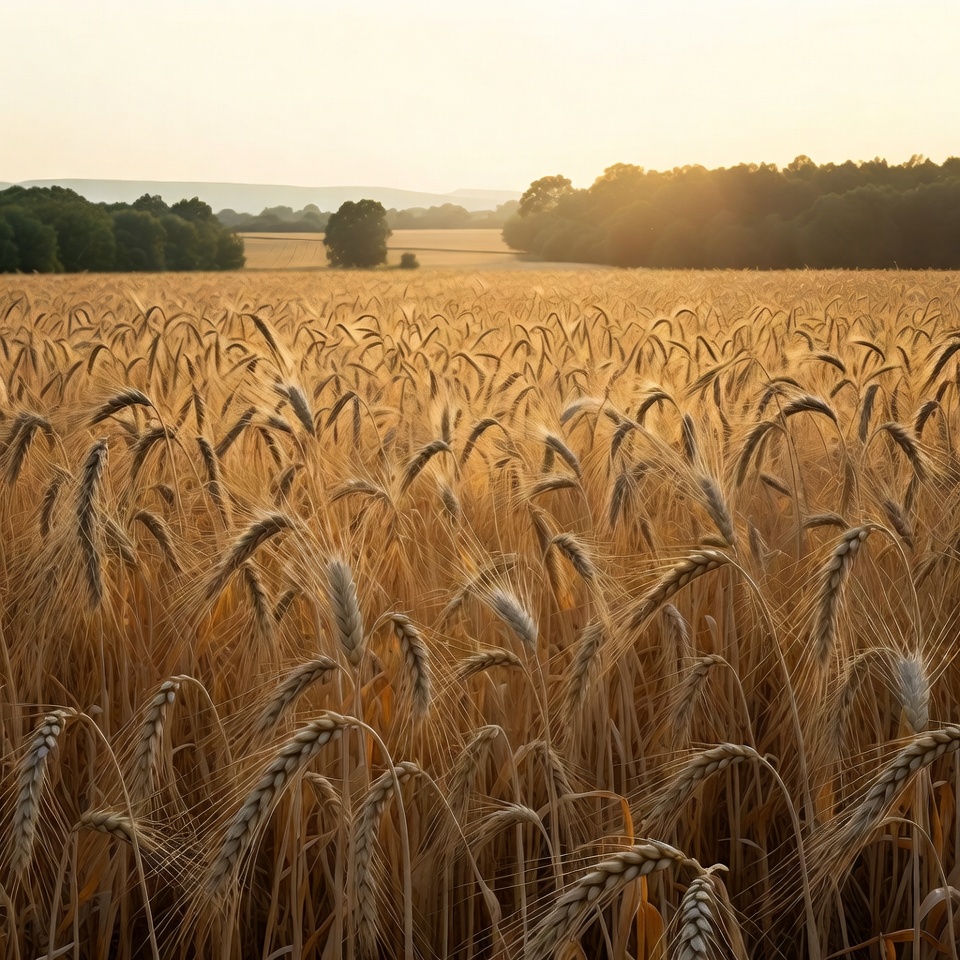 A vast field of golden wheat sways gently under a warm sunset sky. Distant rolling hills and clusters of green trees frame the expansive crop. The sunlight casts a glowing orange hue over the ripe wheat stalks.
