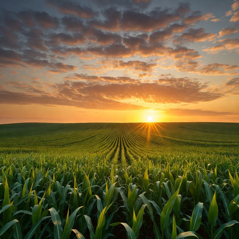 A vast corn field with rows of green cornstalks stretches across rolling hills under a dramatic sunset sky. The sun's rays burst through scattered orange and purple clouds, casting a warm glow over the landscape. The scene features neatly plowed rows leading toward the horizon.