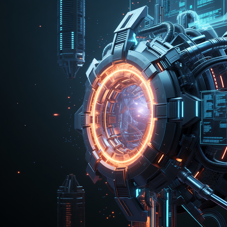 3D render, blue holograms, cyberpunk aesthetic, cyberpunk machine, dark background, dark void, digital art, energy beam, energy vortex, futuristic tech, glowing core, glowing ring, high-tech, mechanical arms, mechanical structure, metallic panels, neon effects, neon lights, orange glow, portal gate, sci-fi art, sci-fi device, spaceship tech, tech illustration, wormhole, futuristic portal